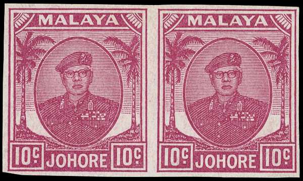 1949 10c magenta imperforate horizontal pair, unmounted o.g. Minor wrinkle, fine for this proof; see footnote after SG 147, formerly listed as SG 139aa. For SG 139