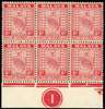 1937 6d scarlet bottom marginal block of six with Plate 1, R10/4 stop omitted at right, unmounted o.g. Fine. SG 27, a, £990