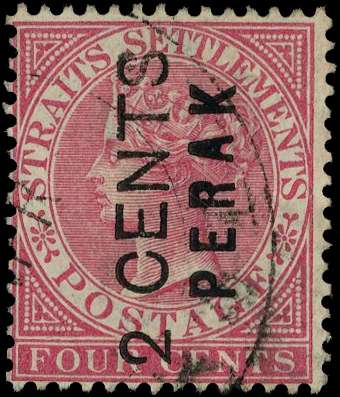 1883 (July) 2c on Straits 4c rose, wmk CA, type 9 vertical "PERAK" opt with type 13 surcharge, lightly cancelled by part cds, with fresh colour.