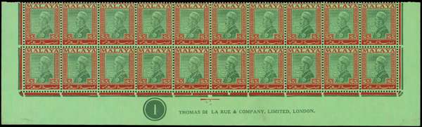 1936 $5 green and red on emerald paper lower two rows of sheet with Plate number and imprint, unmounted o.g., central fold. SG 85, £2200