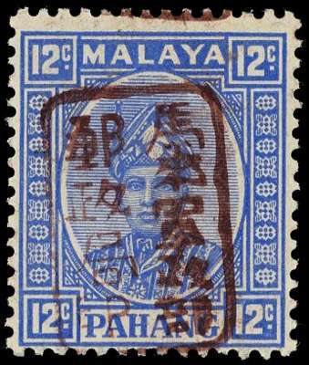 1942 Pahang 12c bright ultramarine with Chop L in reddish brown, large part o.g. Scarce. RPS Certificate (2004). SG J182a, £1200