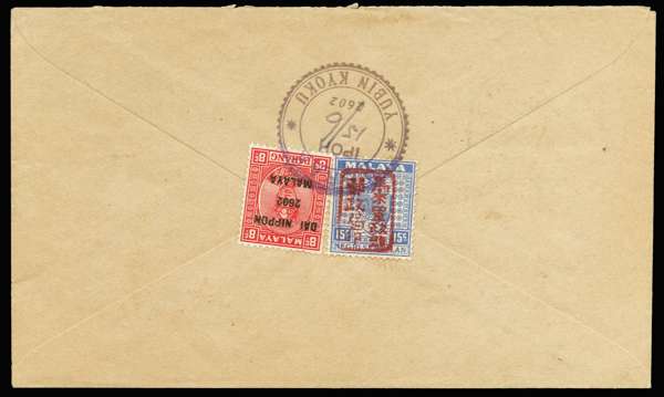 1942 (15 June) censored registered cover, addressed locally to Ipoh, franked (on reverse) by 1942 (Apr) Negri Sembilan 15c ultramarine, chop F in red, and 1942 (May) Pahang 8c scarlet, type 16 opt, tied by type JD1 temporary cds in violet (M/S date). On face, blue/white registration label and violet oval censor cachet. Very fine.