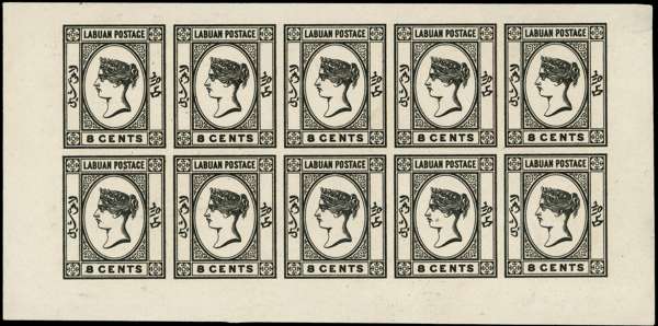 1882 8c original plate proof sheet of ten (5x2) in black on thin card, showing variety 'No dot at lower left' at R2/5. Insignificant wrinkles and marginal blemishes mentioned for accuracy but a unique and important showpiece, with impressive provenance. SG 7,a,var Ex 'Walter Bickly', Cassels (Spink 11/2006, lot 1670 - realised £10,586!), Lahner (Spink 12/3/97, lot 313), Burnett (CRL 10/84, lot 486) and Danson.