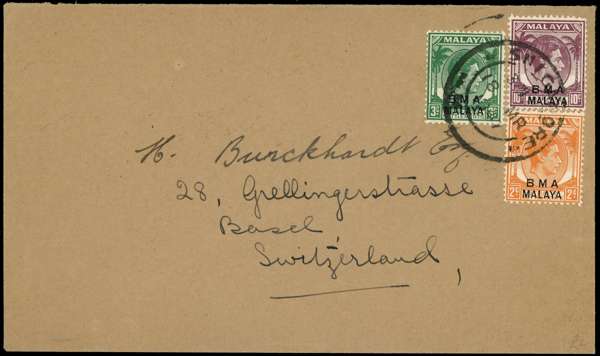 1947 envelope to Switzerland bearing BMA 2c, 3c and 10c cancelled by fine, clear SNIGAPORE error CDS of 18 MR. Rare