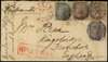 POSTAL HISTORY: 1864 envelope Moulmein to Devon “via Marseilles” in m/s, 1a pair, 4a and 8p cancelled “B/127” obliterators with d/r “MOULMIEN/P.O./2 FEB” in red with “INDIA PAID” and m/s “1s” below. Calcutta and Bombay transits on reverse.