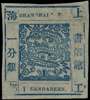 1866 Antique numerals, (candareen in the singular) printing 29, 1ca dull blue on wove paper, four good margins, unused showing a curiously poor print quality with ‘O’ of L.P.O omitted and several other parts of the design similarly absent, fine. SG 11, Liv 10a