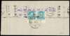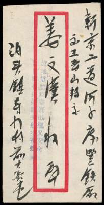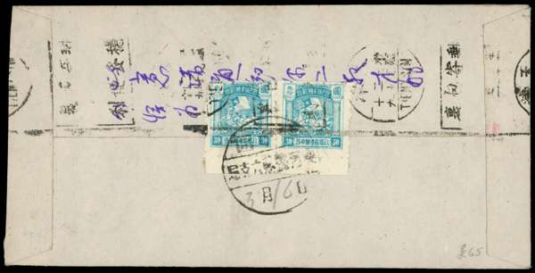 North China; Shanxi-Hebei Border Area late 1940s red band envelope franked on reverse with marginal pair of small format Cavalry Charge $30 turquoise-blue, tied by large single date stamp with added manuscript roman numerals and by Tientsin machine arrival.