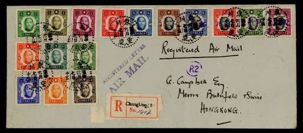 1941 Sun Yat-sen set of 16 on registered airmail cover to Hong Kong tied native Chungking cds, the $2, $5, $10 and $20 with security chops, small violet R2 circular Hong Kong routing handstamp