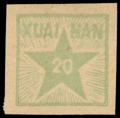 1942 Huainan 20c sage-green, ‘Star’ unused without gum as issued, couple of vertical creases and pin hole, otherwise fine, a scarce stamp. SG EC161