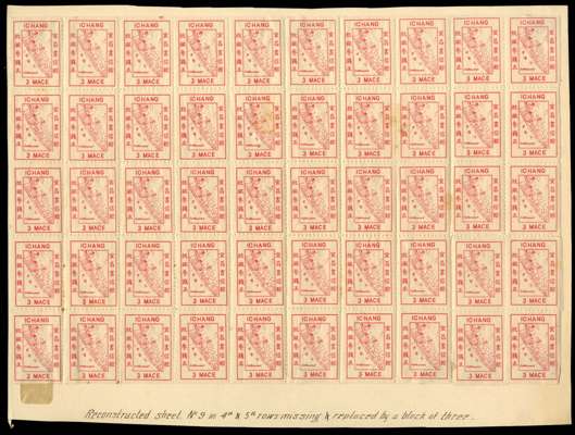 Ichang Local Post: 1895 3m rosine, wide setting rouletted 9, reconstructed sheet of 50, R4/5 missing but replaced by an irregular block of 3, mint large part o.g., rare in this format. SG 14