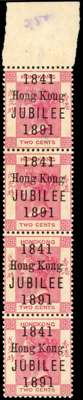 Hong Kong 1891 SG 51 2c Jubilee vertical strip from top of sheet large part o.g.