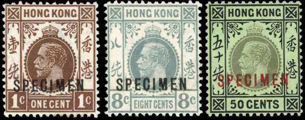 1912-21 1c brown, 8c grey, 50c black/emerald (emerald back), watermark MCA, overprinted SPECIMEN, each with broken ‘M’ (position 41 of the setting), large part o.g., the 1c with a couple of short perfs otherwise a fine and scarce trio, only seven of each possible. SG 100s, 104a, 111ds.