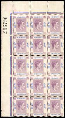 1940 $1 dull lilac and blue top left corner block of fifteen with Requisition Z, showing R3/1 short ‘R’, unmounted o.g.; good gum for this. Also shows minor varieties on R2/3 and 5/2. SG 155, a, £320