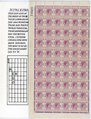 1938-45 $1 dull lilac and blue left pane of sixty, Requisition Z on selvedge at upper left. Unmounted o.g. with brown gum (very good for this); just a little splitting at top. Many plate varieties, including R3/1 short ‘R’. SG 155, a, £770