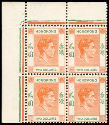 1938-40 $2 red-orange and green top left corner block of four, fresh unmounted o.g. SG 157, £320