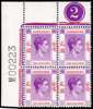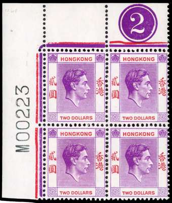 1950 $2 red-violet and scarlet on chalky paper top left corner block of four with Requisition M and Plate 2, fine unmounted o.g. SG 158a, £220