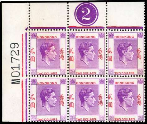1947-52 $2 reddish violet and scarlet n chalky paper top left corner block of six with Plate 2 and Requisition M, unmounted o.g., showing a good duty plate shift down and to left; unfortunately with foxing on the reverse, which has discoloured part of the front. SG 158a, £330