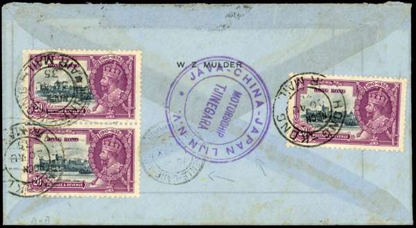 1935 (20 AU) air mail cover to Amersfoort, Holland, endorsed ‘Bandoeng-Amsterdam Air Mail Service’ at top, franked Silver Jubilee 20c with pair on front and pair and single on reverse tied Air Mail cds, reverse with violet triple ring JAVA-CHINA-JAPAN LIJN N.V./ Motorschip/ TJINEGARA' violet handstamp