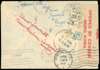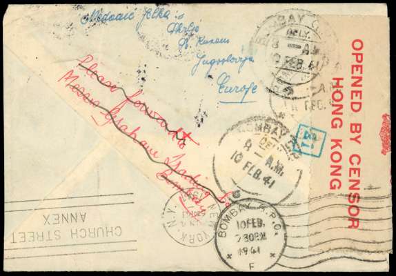 1941 envelope to a ship “S.S.Bor” franked pair Yugoslavia 2d, the ship having moved and envelope forwarded to India and then again from there to New York, Bombay transits on reverse and twice censored, once on obverse with violet triangular handstamp, this overstruck with an internal New York redirection label; on reverse red Hong Kong censor tape tied on reverse with small bluish ‘21’ framed handstamp, a fine redirected cover chasing a ship across two oceans at a time of war, an unusual item