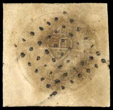 1852 Scinde Dawk ½a white, cut square with large margins, used by diamond of dots cancel, minor horizontal crease and some stains, otherwise fine with clear embossing. A collectable example of this classic Indian stamp. SG S1 £3200
