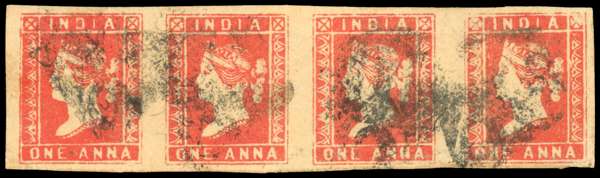 1854-55 1a red Die I ‘A’ stone, positions 18-21 horizontal strip of four, close to good surrounding margins, used, vertical crease to far right stamp, otherwise fine, an attractive multiple. SG 12 £440+