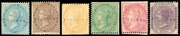 1856-64 no watermark ½a pale blue, 1a brown, 2a yellow, 4a green, 8a carmine and 8p mauve, optd SPECIMEN (Samuel type 5) mint part o.g.; perf trimming (as often seen with reference copies) and other odd minor imperfections, still a scarce assembly with mostly fine appearance. SG 37-53var