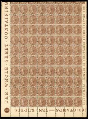 1865 watermark Elephant's Head 1a deep brown, marginal block of eighty (8 x 10, i.e. a quarter of a sheet of 320), with marginal inscriptions, plate number ‘258’ and arabesque ornate pattern at top margin, mint large part o.g. (majority of piece unmounted) odd toned spots, some perf separation and creases to lower right corner and typical horizontal folds, nonetheless an attractive and scarce multiple. SG 59 £1400++
