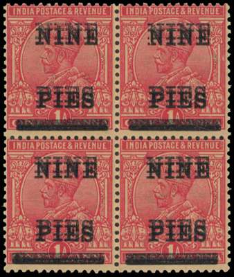 1921 'NINE PIES' on 1a rose-carmine, showing error surcharge double, mint large part o.g. toned gum, still a collectable example of this variety. SG 192c cat £1200+
