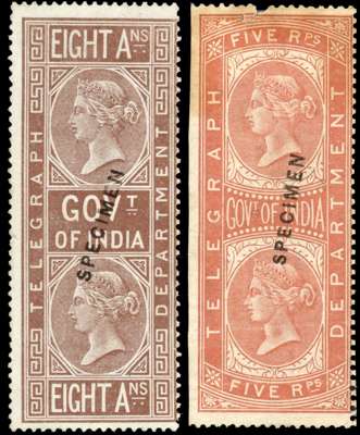 Telegraph. 1869-78 8a brown and 5r orange-brown, first watermark (T19), with De La Rue "SPECIMEN" opt (Samuel type 7), each remarkably with inverted watermark, without gum. The 5r sadly defective (straight edge at left, small piece replaced at top, etc), but the 8a fine. SG T7w, 12w