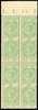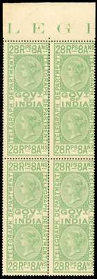 TELEGRAPH: 1869-78 28r8a bright yellow-green top marginal block of four, mint large part o.g. centred to right as nearly always seen with this stamp, otherwise fine, an attractive and scarce multiple. SG T18, £2000