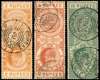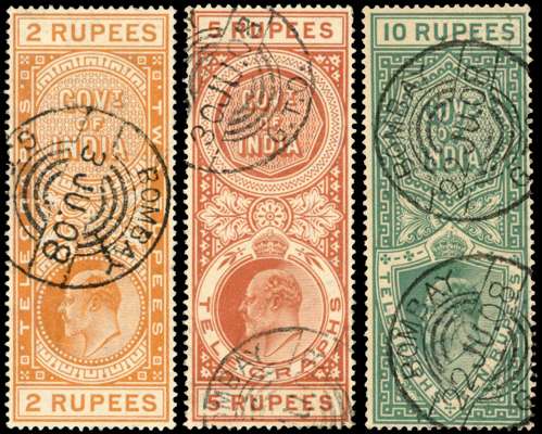 Telegraph. 1904 KEVII 2r brown-orange, 5r orange-brown and 10r bluish green, each used whole with very fine "BOMBAY" telegraphic cds (JU 08 dates), leaving clear profile on 2r and 5r. An attractive matched trio, the 5r ex Ulrich. SG T61-3, £195