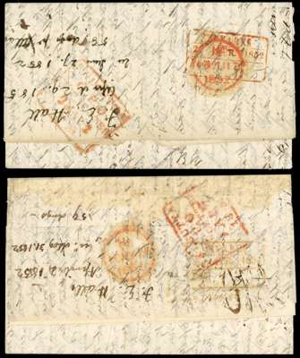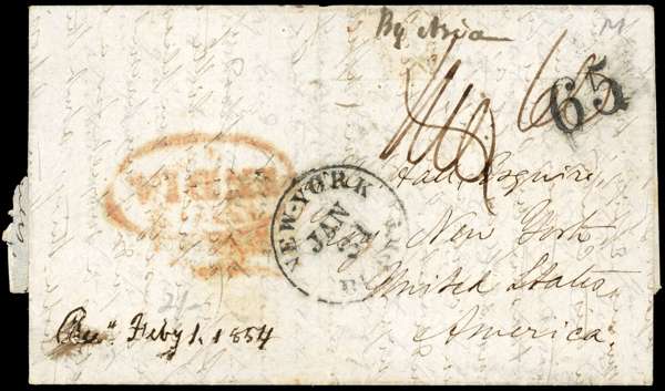 Transatlantic Mail: 1849-54 group of ten entires, the first six addressed to Liverpool and then forwarded to New York, the last four sent direct to New York, the former group with name and address of shipping agent erased and some with ink erosion causing splits, these with red framed INDIA PAID or INDIA handstamps, Liverpool double arc date stamps, most with cursive 19 CENTS handstamps, one in manuscript with red ‘24’ and two altered with black ‘24’ handstamp, one with manuscript “missent & forwarded” with blue Niagara Falls datestamp, in many cases the name of the ship to be taken from Liverpool was added and in this case it was Niagara, one cover from Benares sent direct, endorsed “via Southampton” and “Inland postage only paid”, three further from Benares sent direct without forwarding agents and these with framed red INDIA and ‘65’ rate handstamps; an interesting group.