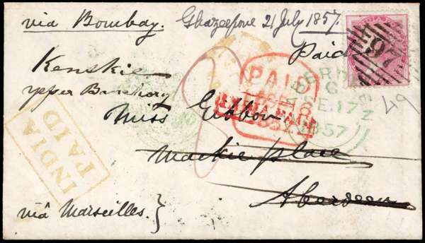 1857 cover to Aberdeen from bearing 8a carmine (Die I), showing type 5 ‘97’ numeral cancel for Ghazeepore, also showing India Paid boxed h/s's in red, London tombstone arrival and Aberdeen d/s in green for SE 17, backstamped by Bombay despatch mark for AU 1 and Aberdeen arrivals for SE 17 and SE 18, offered with original contents, making reference to the Indian Mutiny ‘’ The enemy attached that place in large numbers on the 18th inst, and after a fight in the city for 7½ hours, they were driven off, having left 100 dead in the streets'' A fine and fascinating cover. SG 49