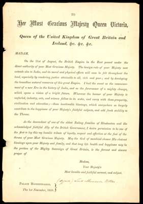1858 printed broadside oath of allegiance from an Indian Prince in response to Queen Victoria's Proclamation to the princes, chiefs, and people of India after the establishment of Crown rule. ‘’I hail the event as the commencement of a new Era in the history of India, and as the forerunner of a mighty change , which opens a vision of a bright future.'' Archival folds and age related wear, otherwise fine, an interesting document, ideal accompaniment for an exhibit.