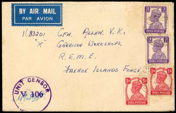1944 envelope with FPO 263 cancels of 4 MR, Unit Censor mark in violet, to the very unusual destination of the Faeroe Islands; small faults