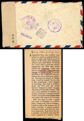 1945 envelope from Ledo to North Dakota, bearing 1½a largely covered by Censor tape. Three Chinese markings on reverse, one a scarce ‘PASSED’ Censor mark. Roughly opened at left, rather worn, an interesting cover