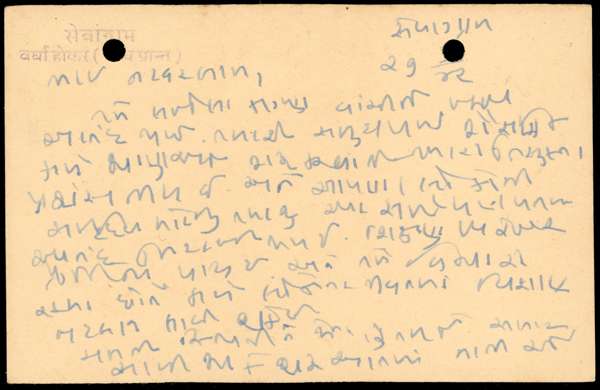 MAHATMA GANDHI: 1942 Postal stationery 9p card addressed to Natvarlal Motilal Patel, Jogidas's pol, Baroda postmarked by double-ring datestamp for ‘27 03 42’ written in Gujarati stating 'Brother Natvarlal, I was really happy reading the letter you sent. Your excitement of starting the educational work in your Community is really commendable. And your sacrifice for the prosperity of our people brings me a lot of joy. Education is truly the foundation of progress. What you are thinking can bring significant change in people’s lives. Considering the mental state, my advice would be to start small and good, and first inform about some highly important tasks. This might help your companion understand this perspective. Do not rush in this work – the task you are doing requires both patience and perseverance. Blessings of Bapu (Mahatma Gandhi)'; two filing holes not unduly detracting from rare signed item