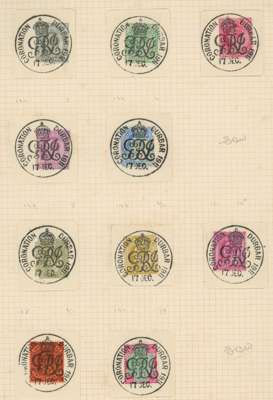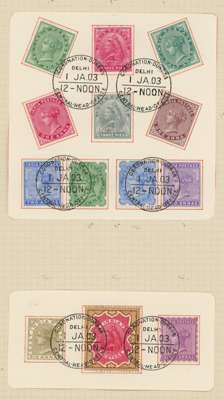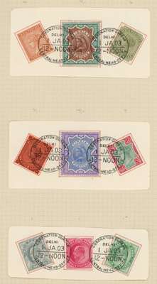 1903 neatly displayed on old album leaves, values to 5r tied by Coronation-Durbar cds “1 JA.03” and 1911 values to 1r on pieces cancelled “CORONATION DURBAR 1911/17 DEC”, neat and attractive (32)
