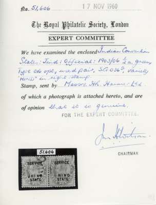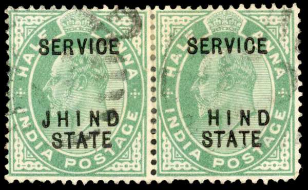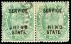 Officials. 1903-6 ½a green horizontal pair, right stamp with ‘HIND’, lightly used. The variety with a short perf at base and a blunt corner. RPS Certificate (1960, when SG O36a). SG O25a, £500
