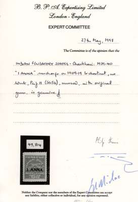 1939 1 ANNA on 1r chestnut, large part o.g. The perfs, centering and gum are all well above average for this stamp; very scarce in this condition. BPA Certificate (1998). SG 56, £2500