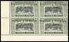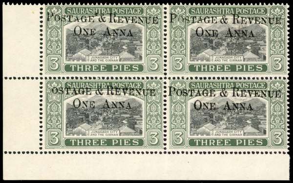 1950 1a on 3p black and green lower left corner block of four, unmounted o.g., R8/1 ‘P’ of POSTAGE omitted. Very fresh and fine. SG 61, a, £620