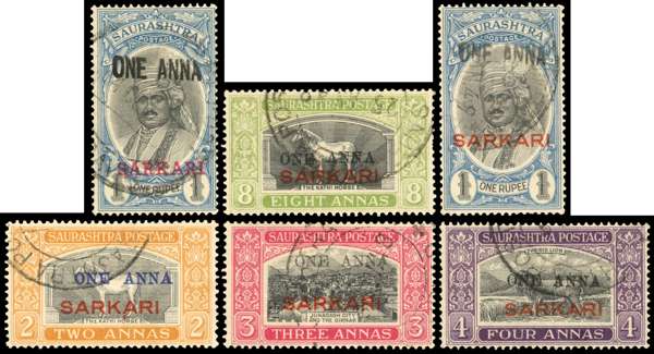 Officials. 1948 1a surcharges on 2a, 3a, 4a, 8a and 1r (seriffed and unseriffed SARKARI), fine used. SG O14-19, £481