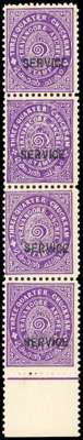 Officials. 1940-4 ¾ch reddish violet vertical strip of four from foot of sheet, unused without gum as issued. The two central stamps perf 11, the upper and lower stamps perf compound of 12 and 11. Scarce multiple. SG O94b, d