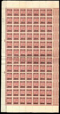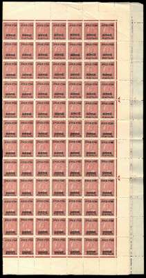 Official. 1949-51 4p on 8ca carmine, perf 11, complete folded sheet of 168, showing error ‘FOUB’ on R2/3 LP, fine unused (no gum as issued), a remarkable survival in this form. SG O2b/ba, cat £1058+
