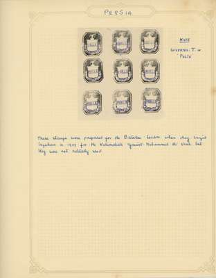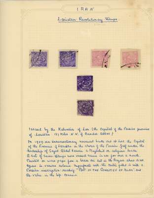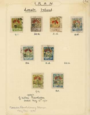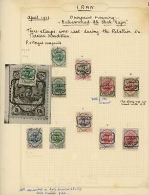 Revolution and Rebellion issues with 1908 Azerbaijan Provisional Issues unused or o.g., 1909 duplicated Lar issues used, 1909 unissued Ispahan issue, 1912 Senneh Rebellion forgeries plus a 6ch piece affixed to official Iranian Post Office letterhead dated May 1912 describing the use of the stamp with special manuscript in the absence of the handstamp, and 1920-21 Gilan rebellion issues genuine on pieces used
