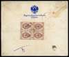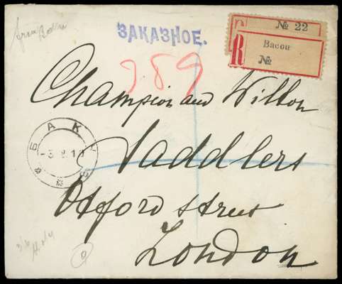 1910 registered envelope addressed to “Champion and Wilson/ Saddlers/ London” with blue embossed Russian Coat of Arms and two-line ‘Legation Imperiale de Russie/Teheran’, carried by hand to Baku due to the Revolution and posted there with block of four 5k cancelled by single double-ring cds, repeated on front; some insignificant staining on reverse. Horizontal crease through stamps. A good example of mail diverted or re-routed due to conflict.