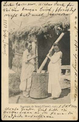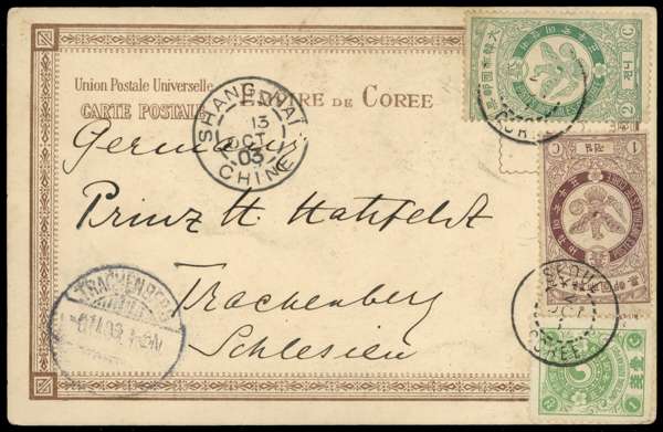 Korea 1903 (2 Oct) picture postcard to Germany bearing 1ch green and Falcon 1ch and 2ch tied Seoul Coree cds, Shang-Hai Chine transit cds of 13 Oct and Trachenberg arrival cds, fine condition