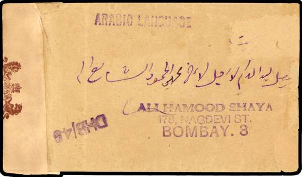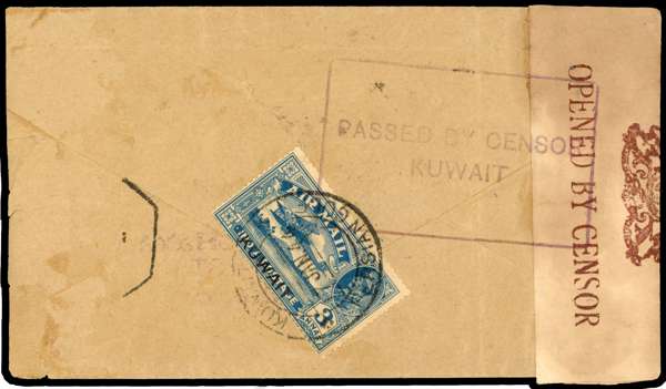 1944 censored envelope to Bombay (reduced at right) with 3a airmail on reverse, 17 JA CDS. Boxed PASSED BY CENSOR KUWAIT (see Donaldson page 130) and censor tape, envelope with some faults. SG 32