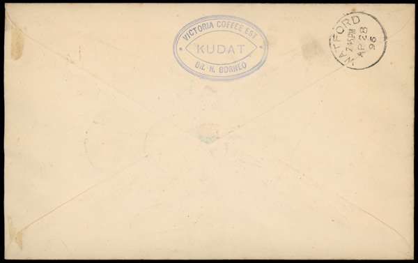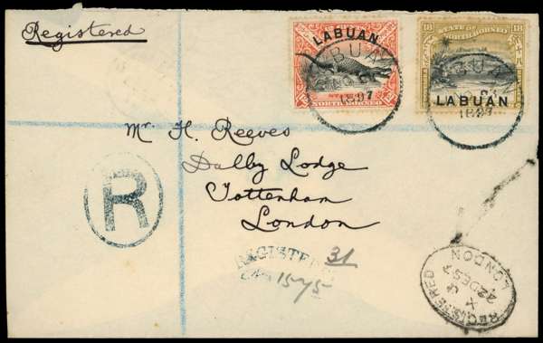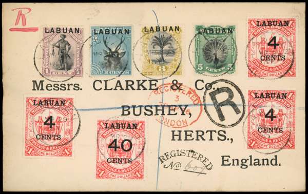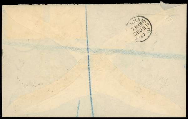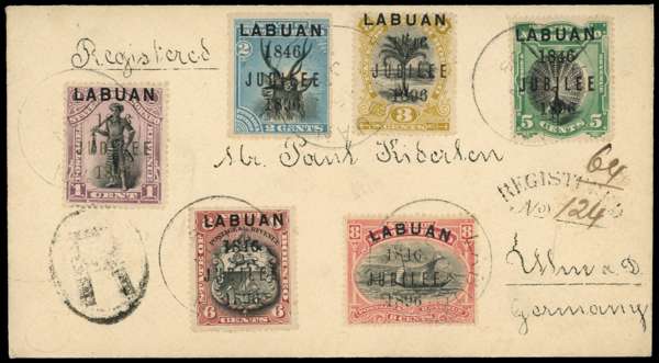 1896-7 four registered philatelic covers. One with 1894 1c-5c, 1895 4c on $1 (3) and 40c on $1; Kiderlen cover with Jubilee set; and two 1897 covers, one with SG 95a and 99a, the other with SG 96a, 97a. The latter pair with some slight foxing, otherwise fine