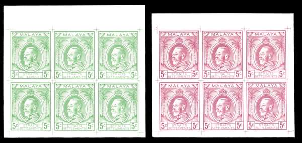 1933-4 Survey Department essays. Two fine blocks of six in green and pink, Norris Type V, fresh
